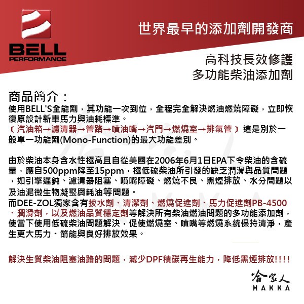 美國BELL 全效多功能柴油添加劑 新包裝 除碳 驗車神器 DEE-ZOL 改善油耗 去除積碳 柴油精 哈家人美國BELL 全效多功能柴油添加劑 新包裝 除碳 驗車神器 DEE-ZOL 改善油耗 去除積碳 柴油精 哈家人Fuel Additives & Savers【 哈家人 】油Shop