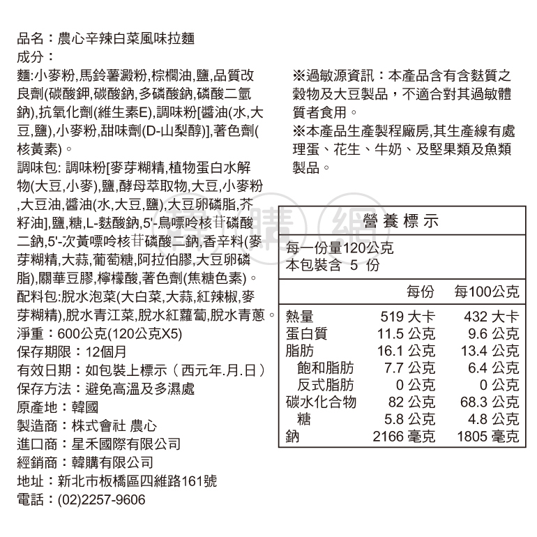 韓國農心辛辣白菜風味拉麵600g(120gX5入)超值包【韓購網】NONG SHIM韓國農心辛辣白菜風味拉麵600g(120gX5入)超值包【韓購網】NONG SHIMInstant Noodles《韓購網》KOREA SHOP韓國專賣店