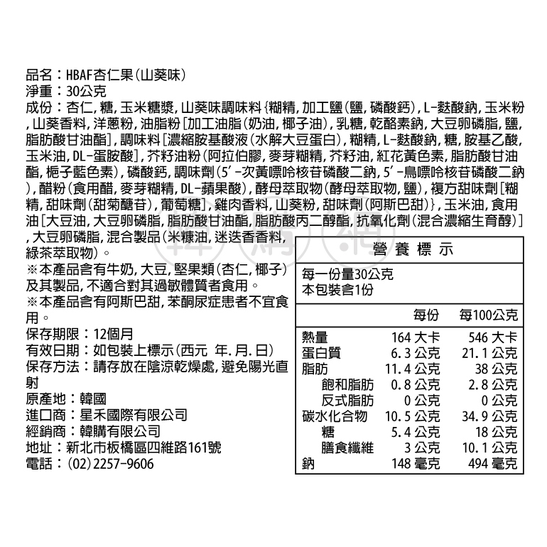 韓國HBAF 杏仁果(山葵味)30g【韓購網】韓國HBAF 杏仁果(山葵味)30g【韓購網】Nuts《韓購網》KOREA SHOP韓國專賣店