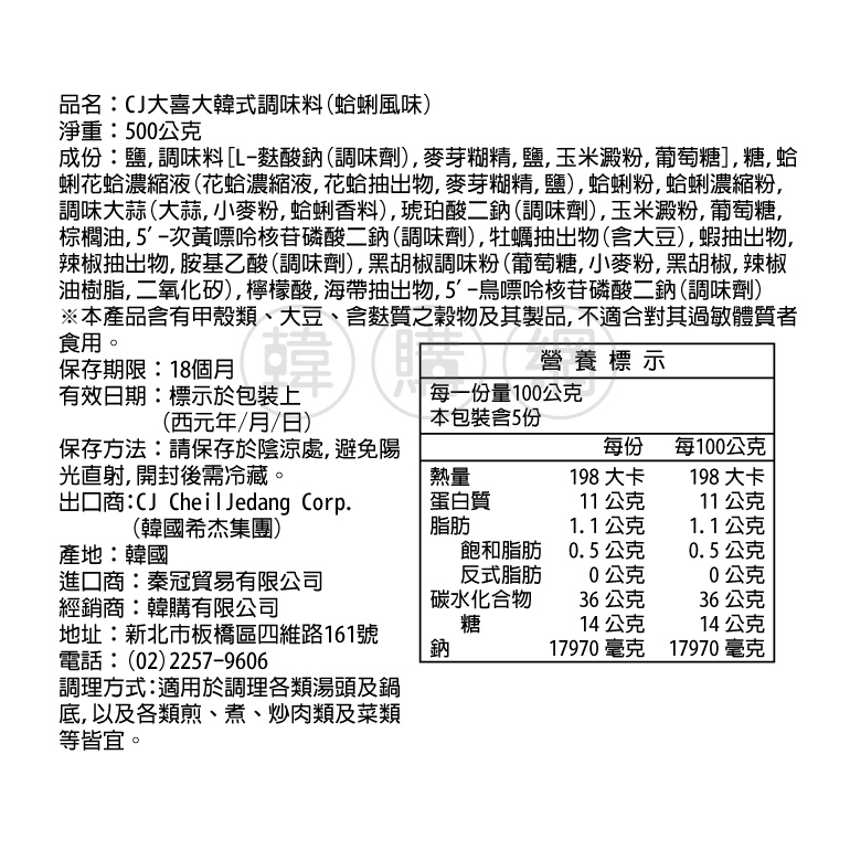 韓國CJ大喜大 韓式調味料(蛤蜊風味)500g(2026.09.19有效)【韓購網】韓國CJ大喜大 韓式調味料(蛤蜊風味)500g(2026.09.19有效)【韓購網】Seasonings & Condiments《韓購網》KOREA SHOP韓國專賣店