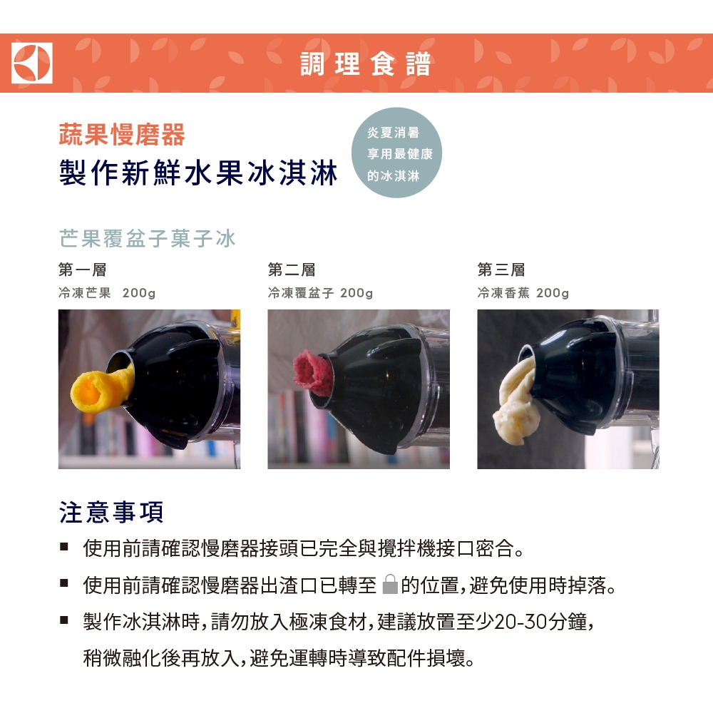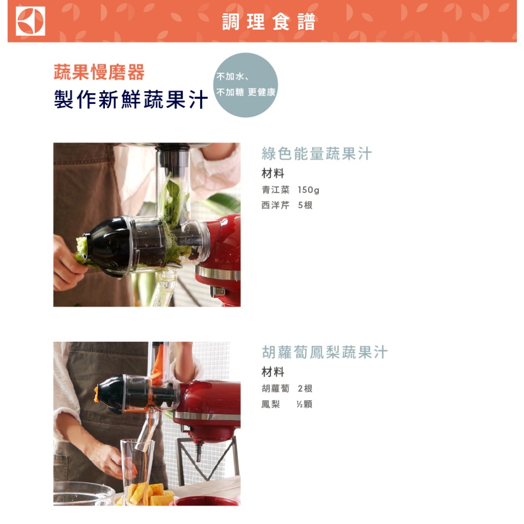 Electrolux 伊萊克斯 抬頭式攪拌機專用配件SMM01/MGM01/CJM01/PMM01義大利麵製麵器PMM01|蔬果慢磨器SJM01|柑橘榨汁機CJM01|切絲切片組SMM01|絞肉刀組MGM01Others 伊萊克斯家電旗艦館