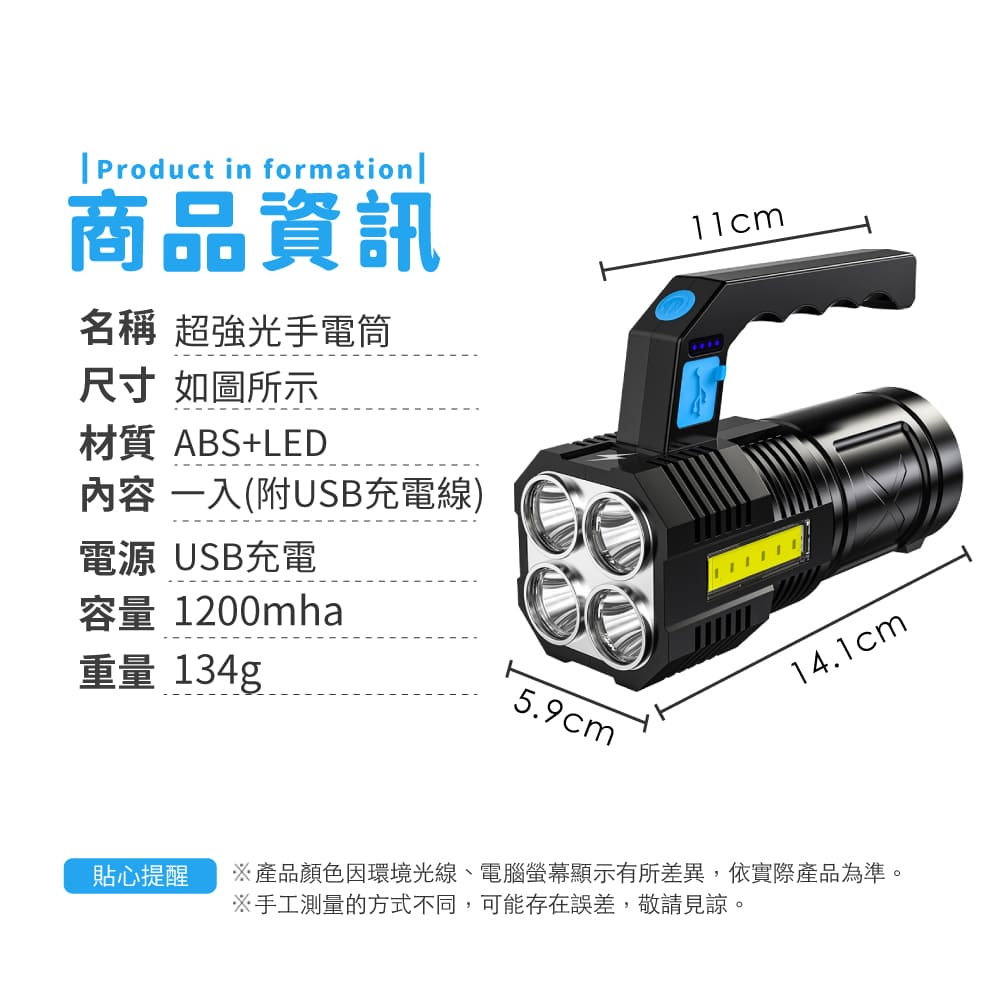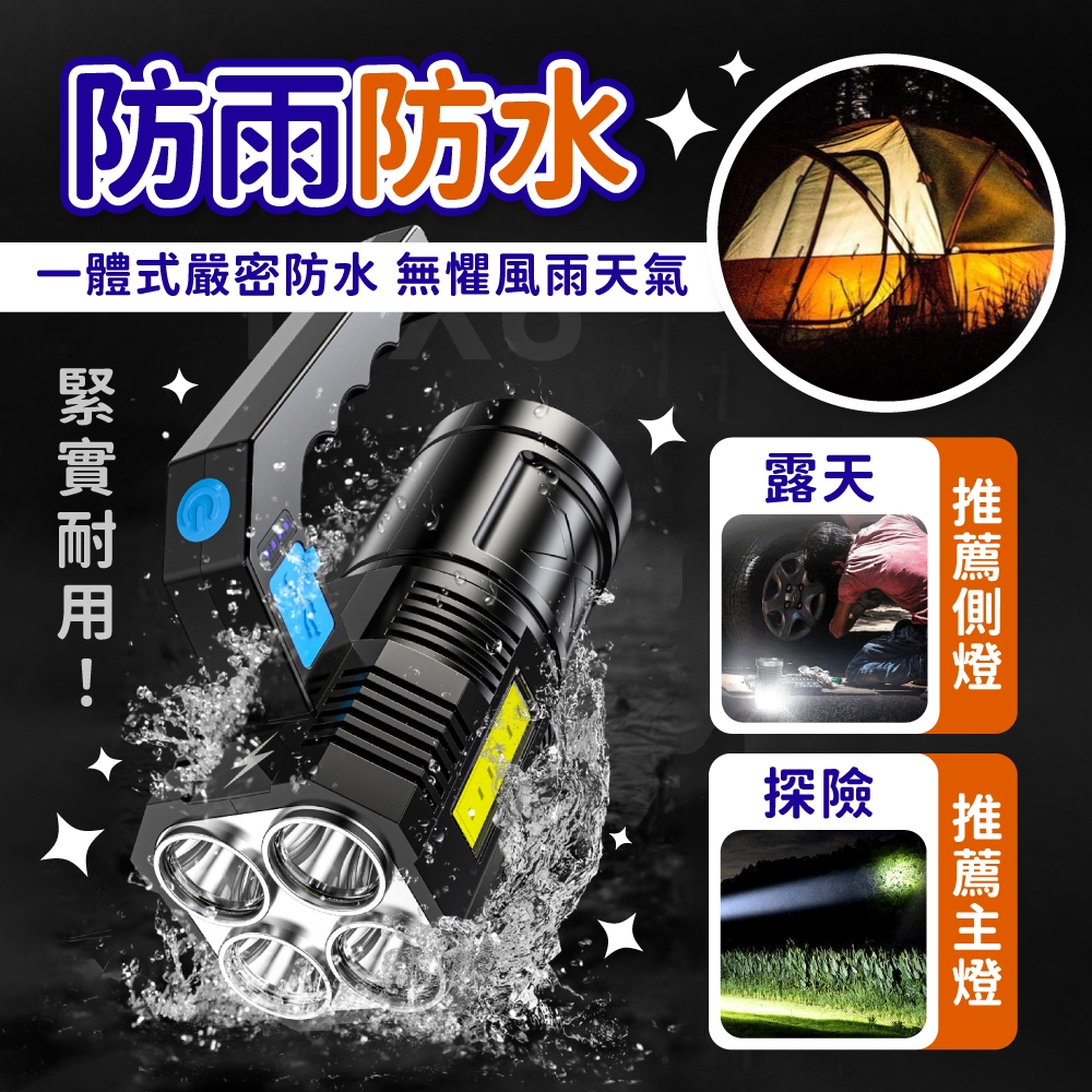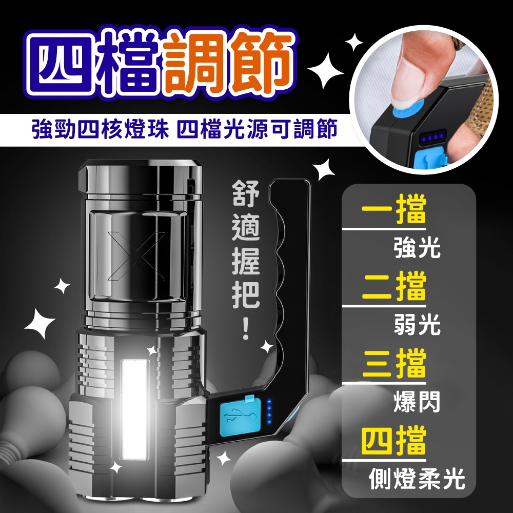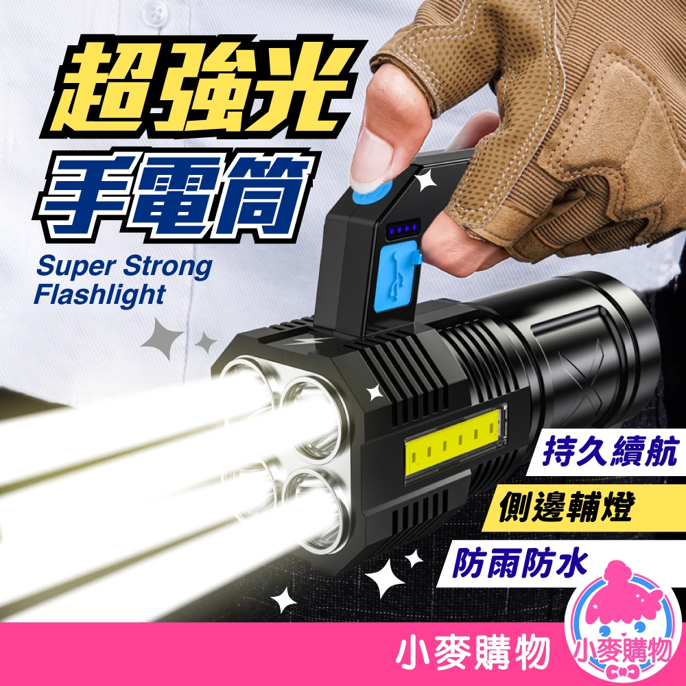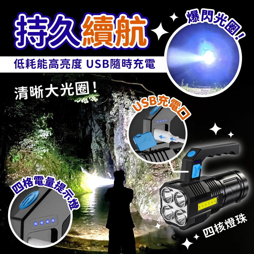 超強光手電筒 手提探照燈 手電筒 手提燈 照明燈具 手提led燈 充電燈 強光 USB充電【小麥購物】【G795】黑色四燈Camping & Hiking 小麥購物