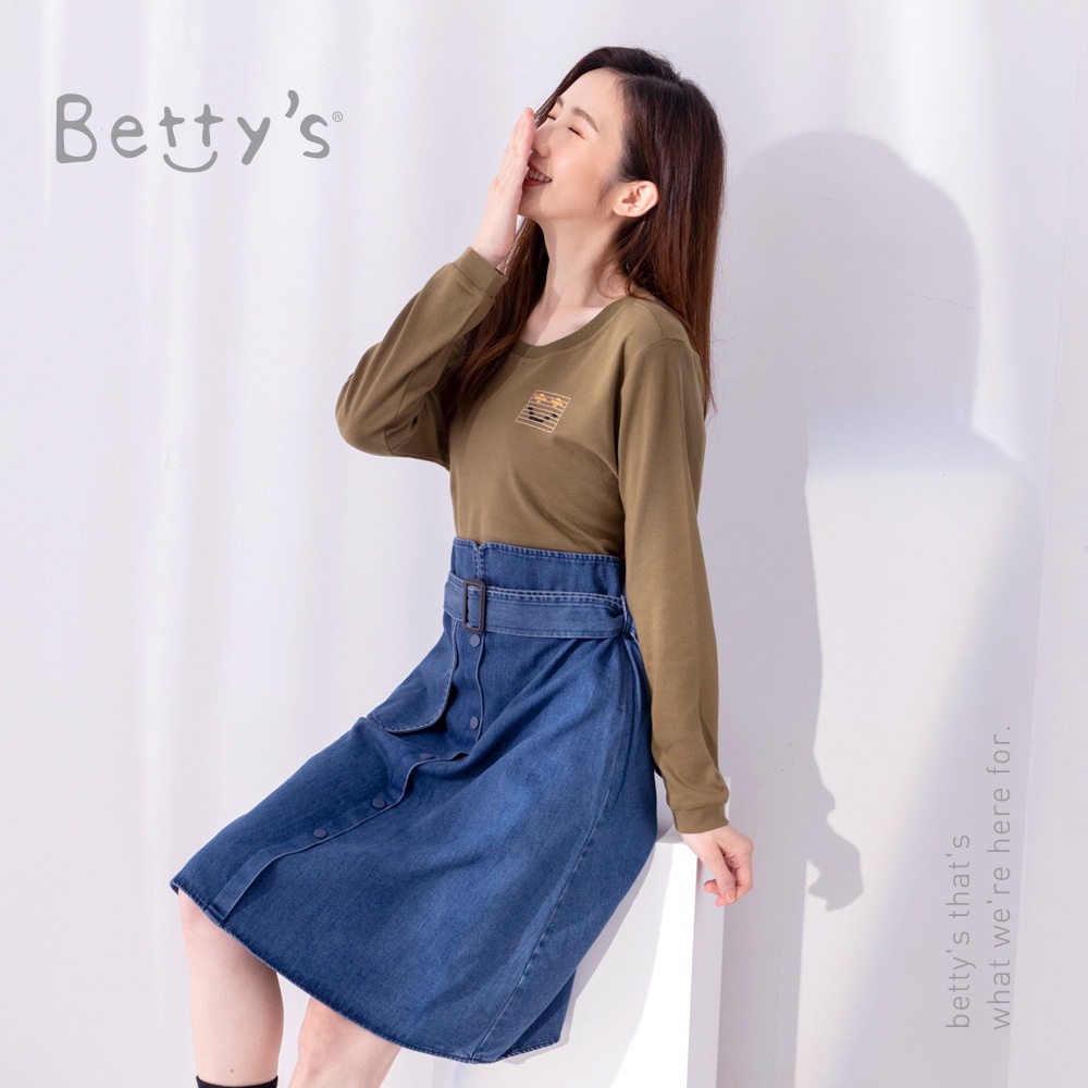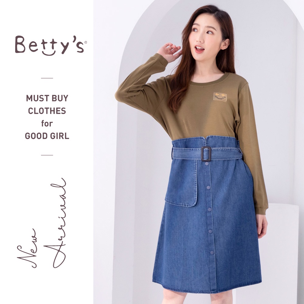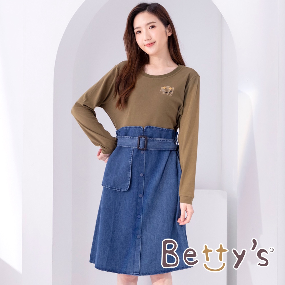 betty’s貝蒂思(05)圓領棉T拼接牛仔洋裝(軍綠)軍綠,M|軍綠,Lbetty’s貝蒂思