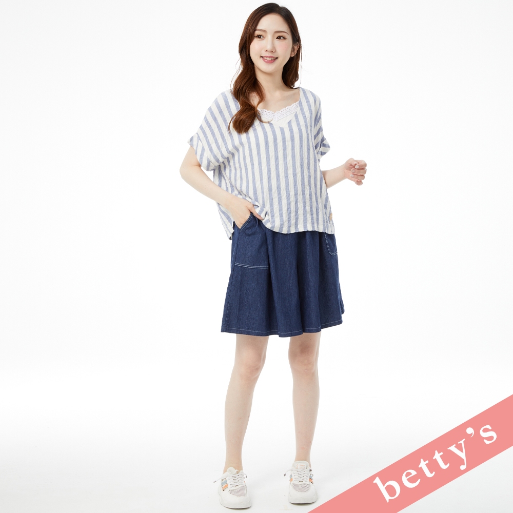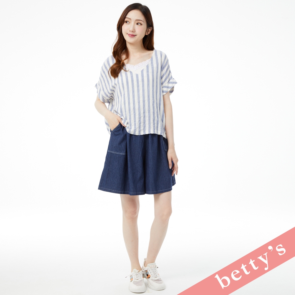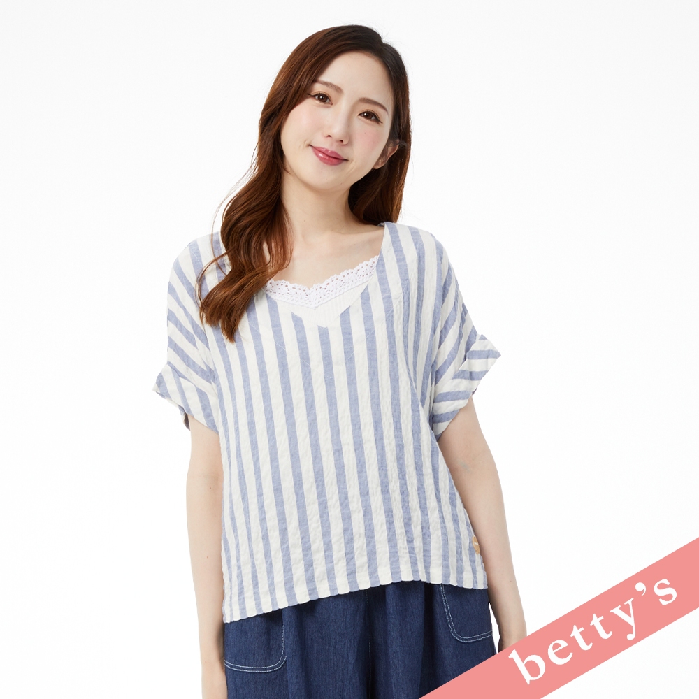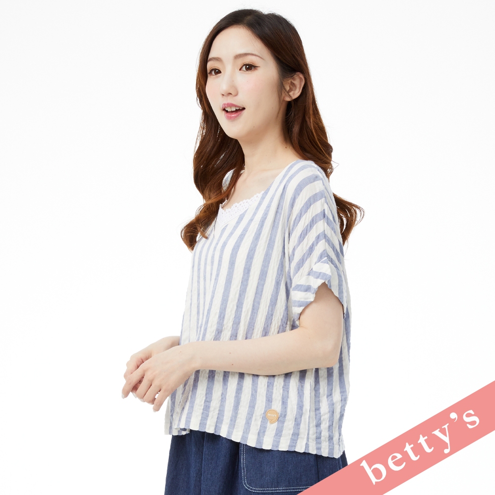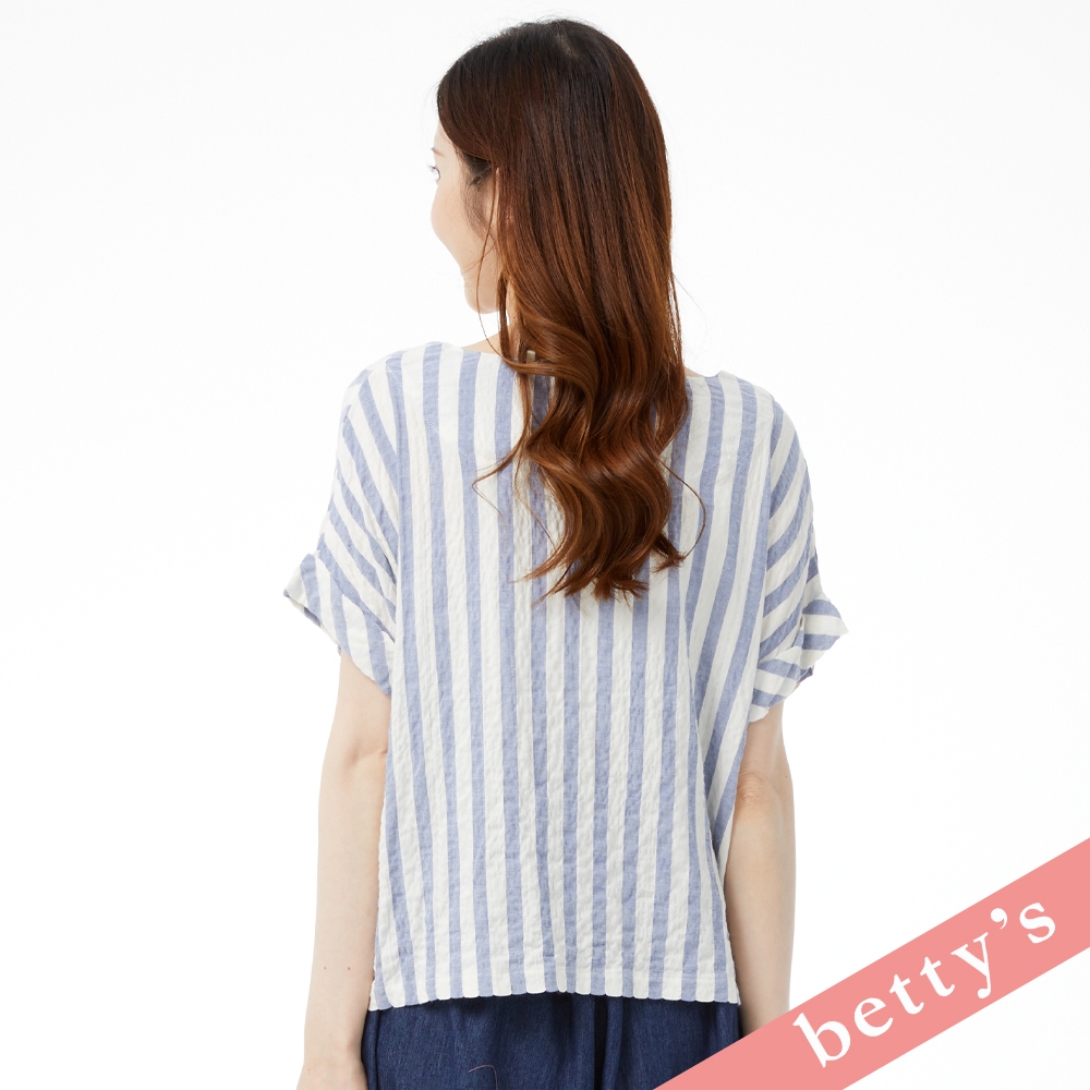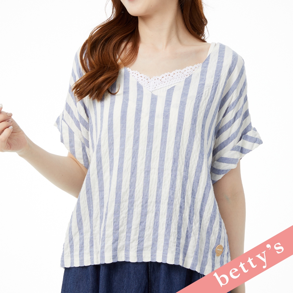 betty’s貝蒂思(31)麻布皺皺面料條紋V領上衣(藍色)藍色,M|藍色,LT-shirtsbetty’s貝蒂思