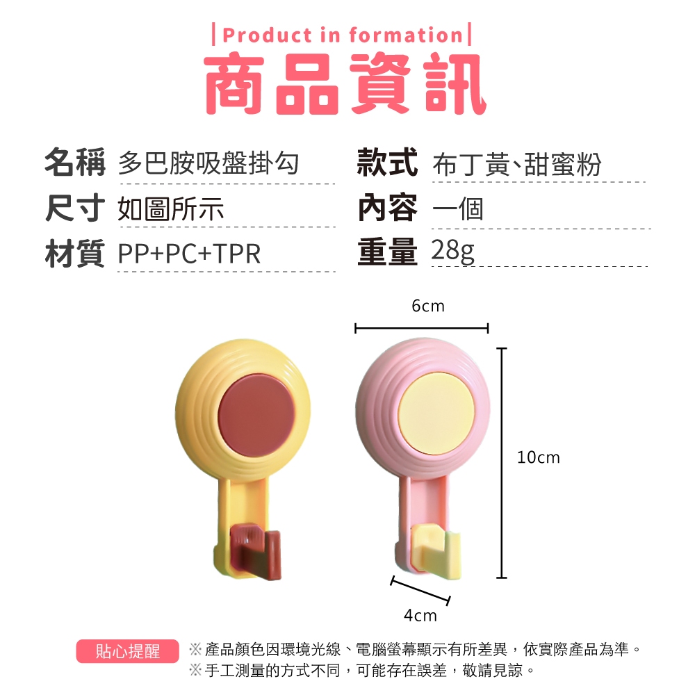 多巴胺吸盤掛勾 吸盤掛勾 掛鉤 吸盤 掛鈎 免釘掛勾 浴室掛鉤 廚房掛鉤 免打孔掛鉤 牆壁掛鉤【小麥購物】【G832】甜蜜粉|布丁黃Hooks 小麥購物