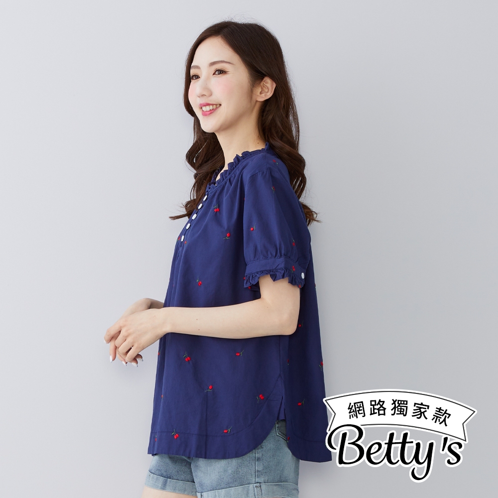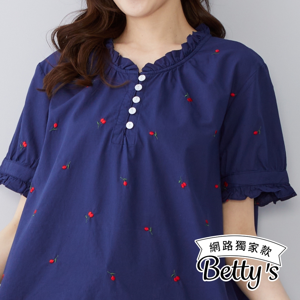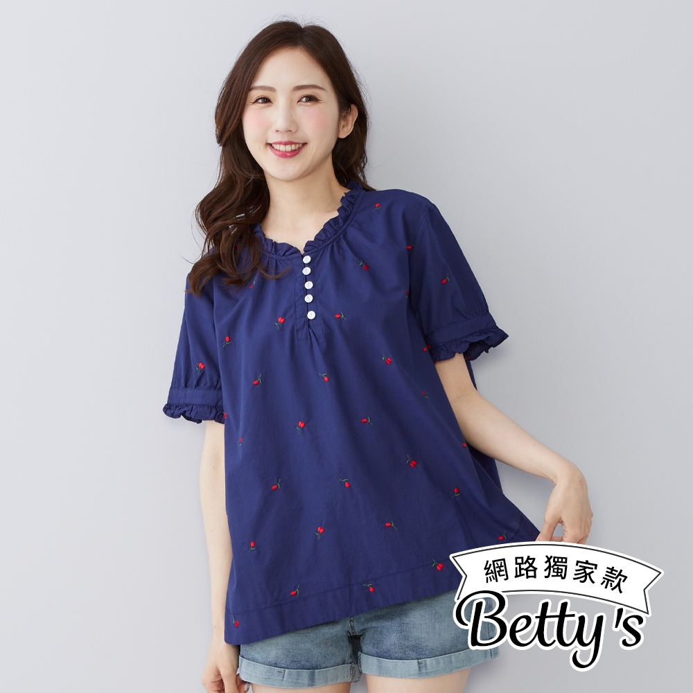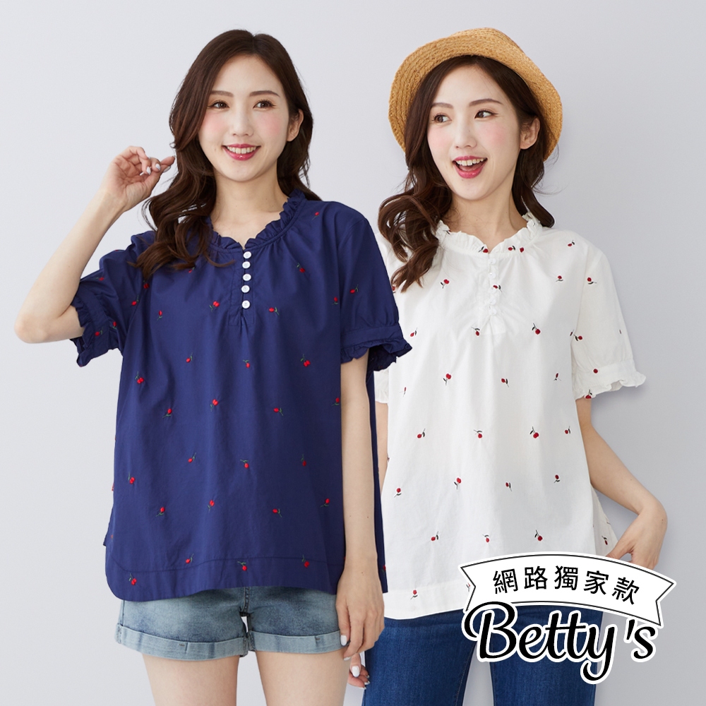betty’s貝蒂思(50)水果印花荷葉邊立領上衣(共二色)深藍|白色T-shirtsbetty’s貝蒂思