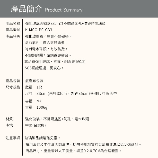 強化玻璃圓鍋蓋33cm強化玻璃圓鍋蓋33cmOthers TRANYO 品牌鍋具館