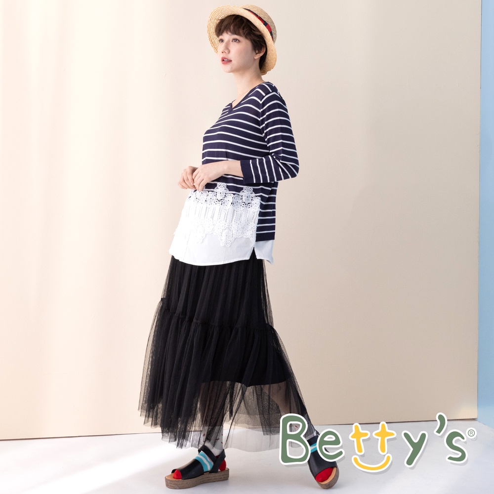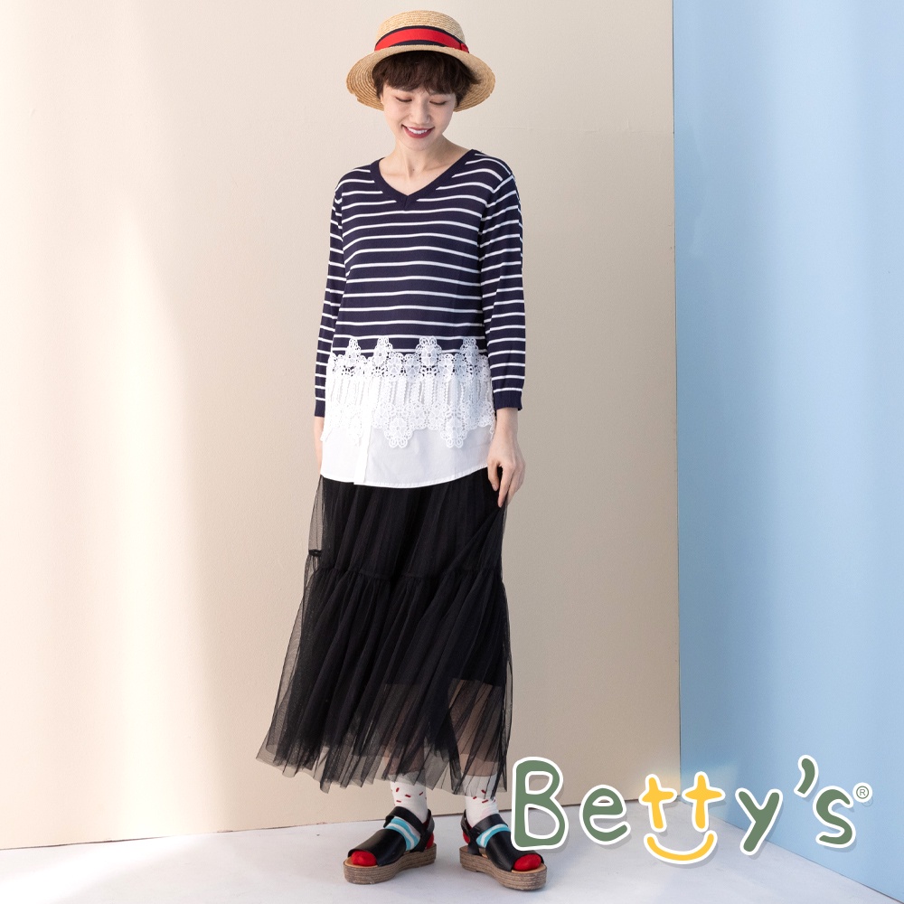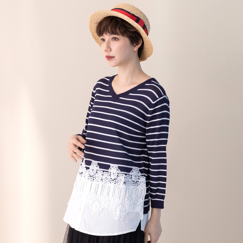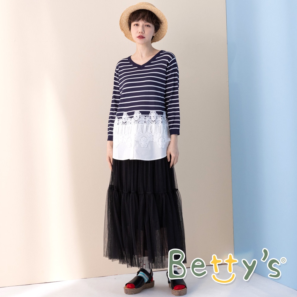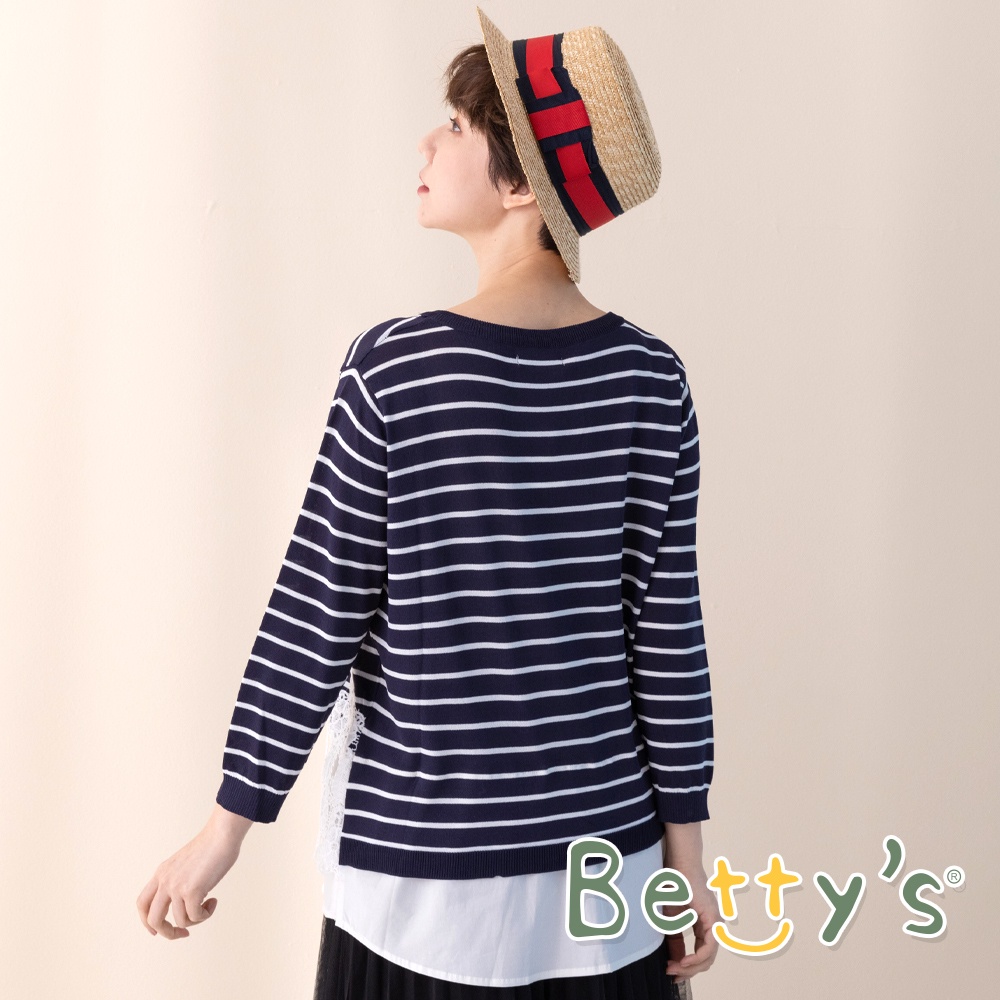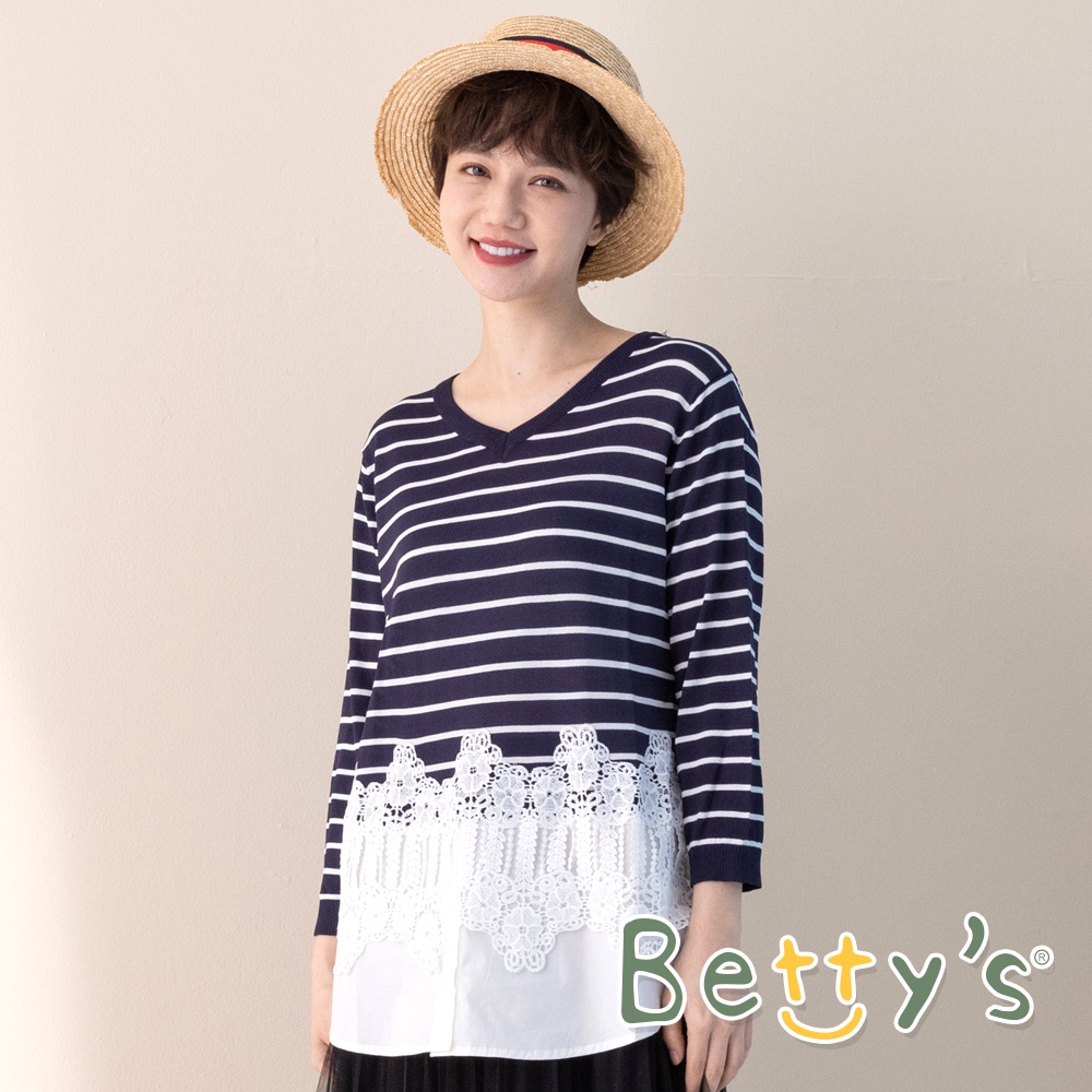 betty’s貝蒂思(11)條紋拼接蕾絲七分袖針織衫 (深藍)深藍,M|深藍,Lbetty’s貝蒂思
