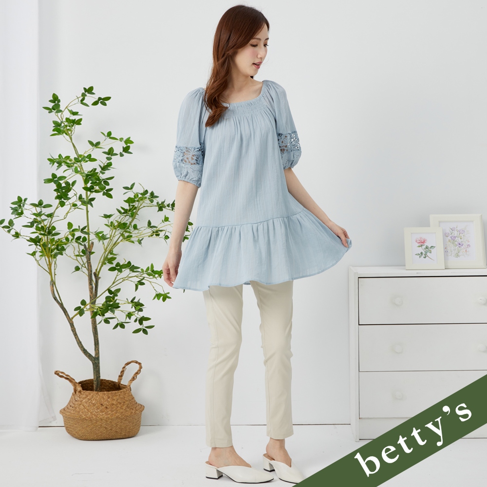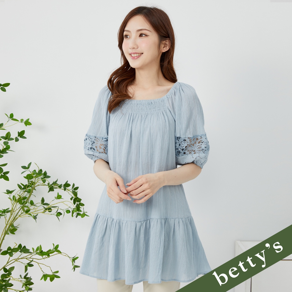 betty’s貝蒂思(35)2WAY鏤空蕾絲拼接皺褶綁帶長版上(淺藍)淺藍,M|淺藍,L|淺藍,XLT-shirtsbetty’s貝蒂思