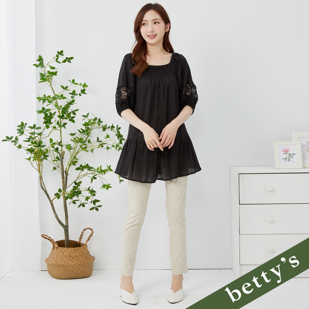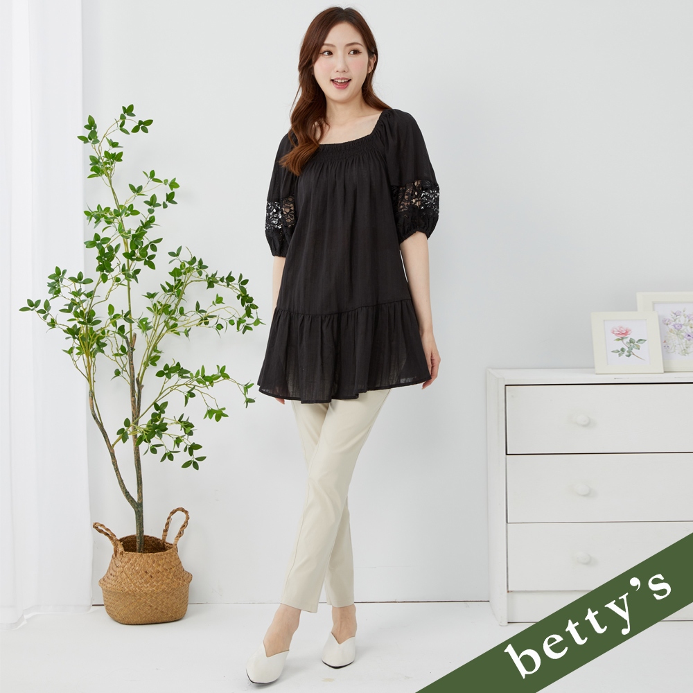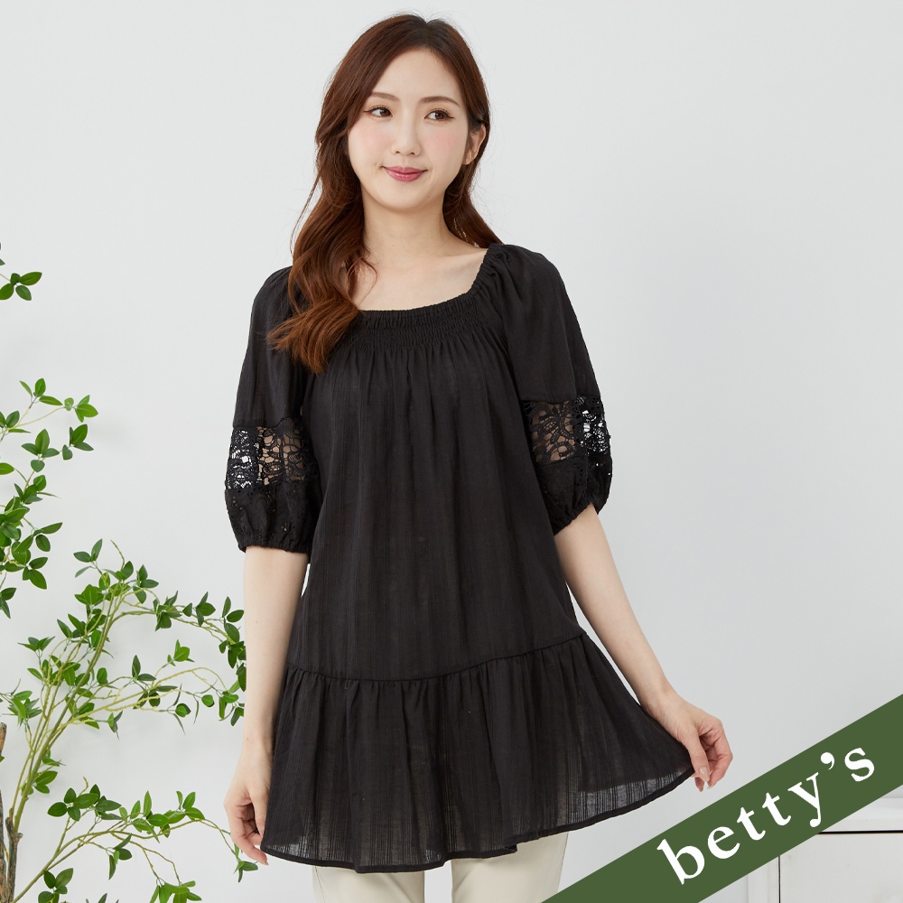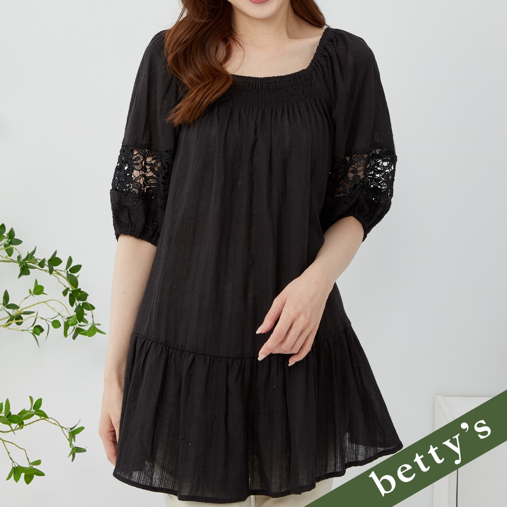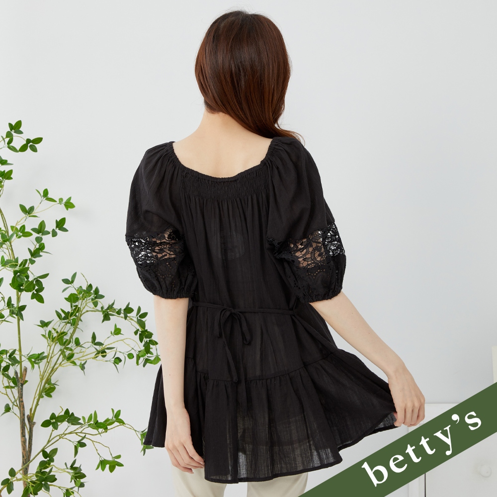 betty’s貝蒂思(35)2WAY鏤空蕾絲拼接皺褶綁帶長版上衣(黑色)黑色,M|黑色,L|黑色,XLT-shirtsbetty’s貝蒂思