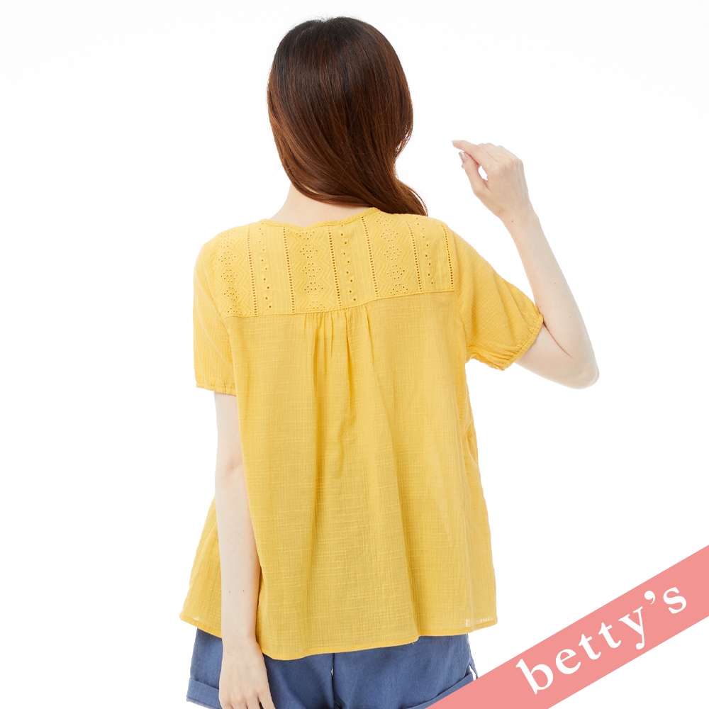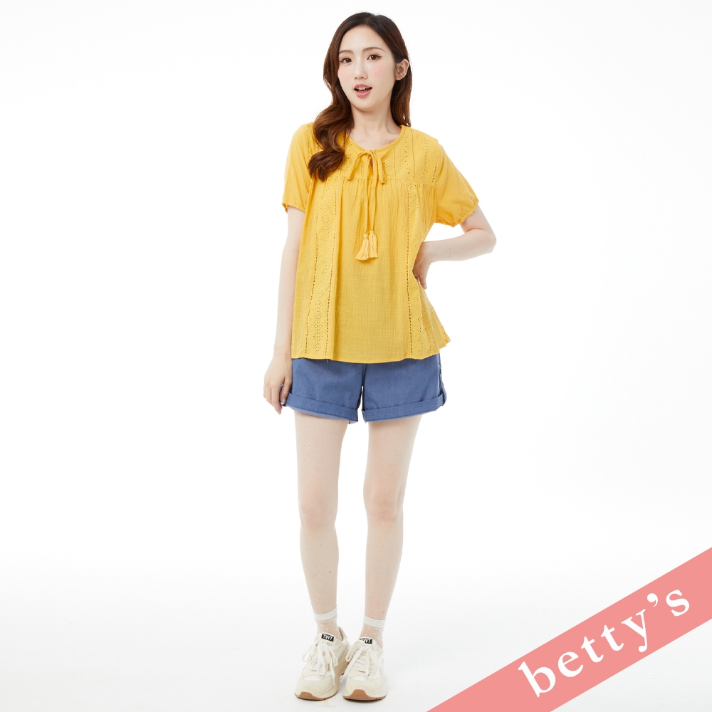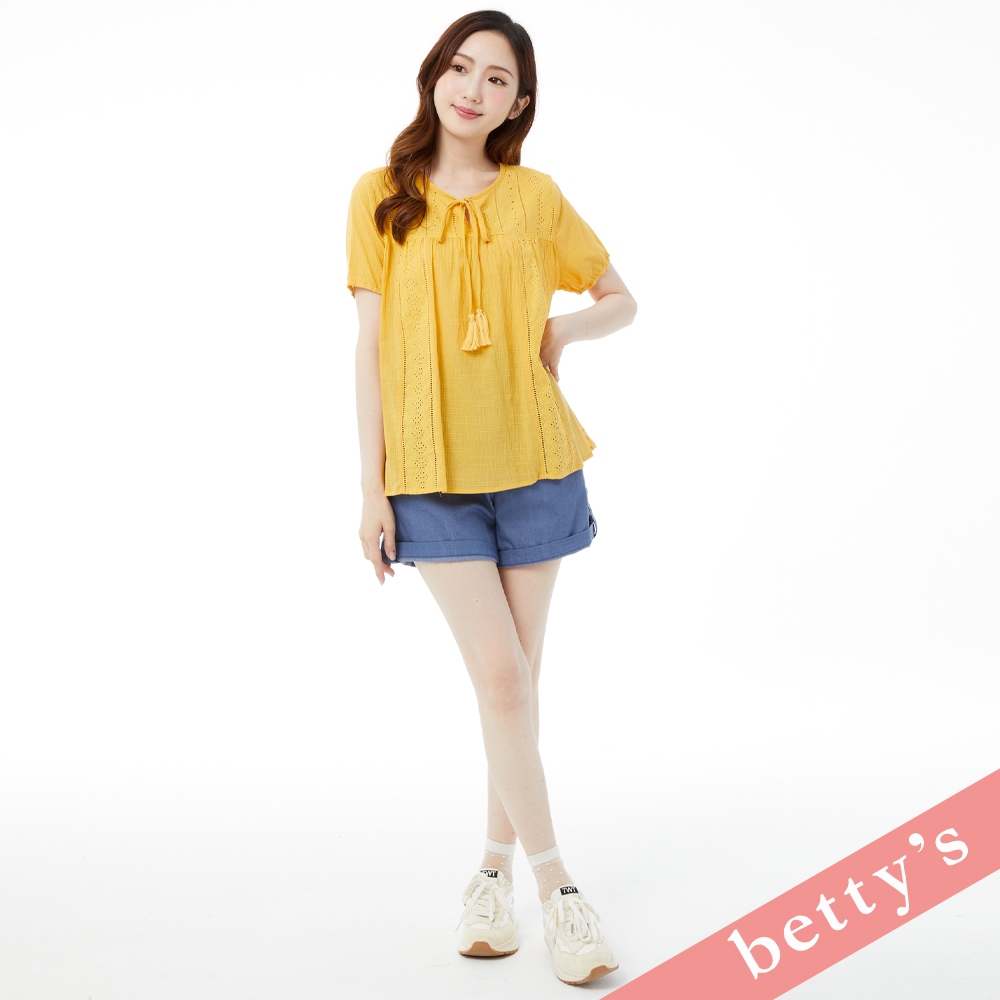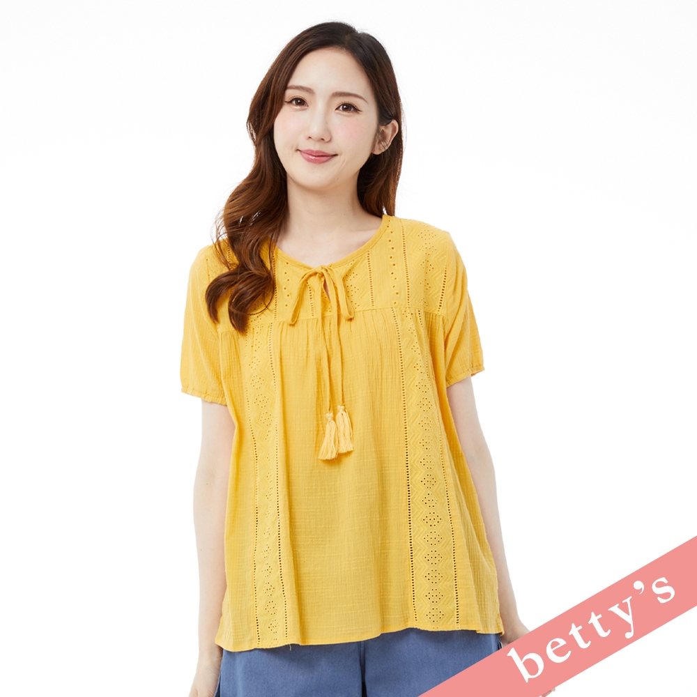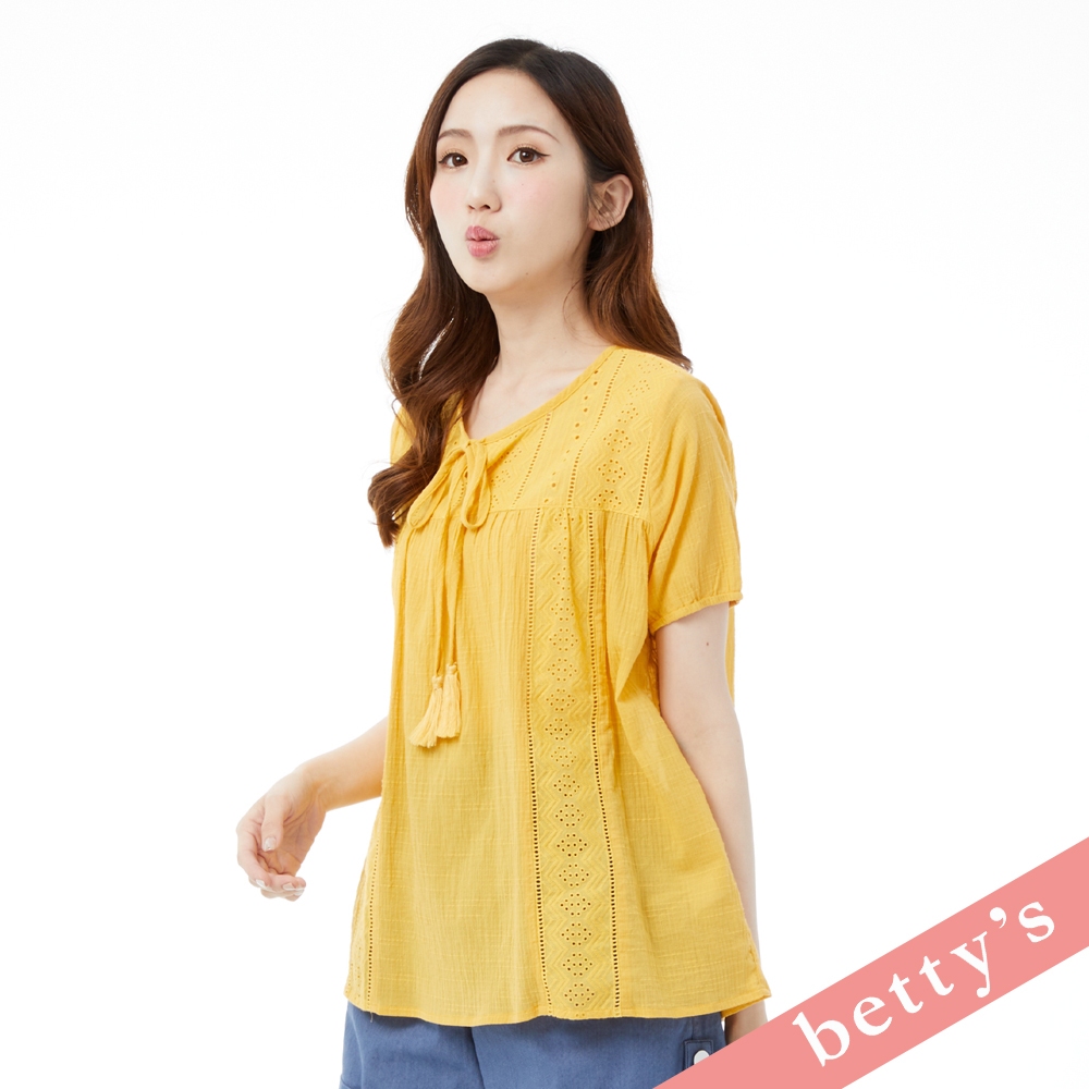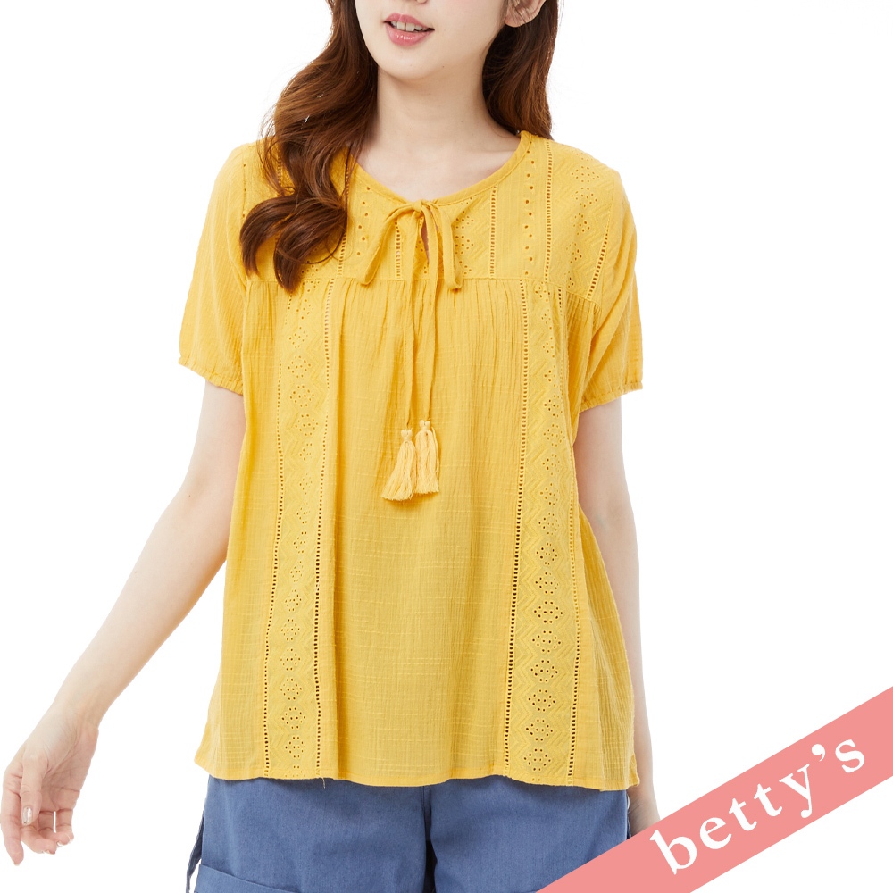 betty’s貝蒂思(31)波西米亞蕾絲拼接領口綁帶流蘇上衣(黃色)黃色,M|黃色,L|黃色,XLT-shirtsbetty’s貝蒂思