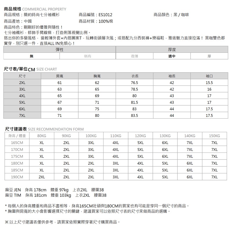 【胖胖星球】中大尺碼‧簡約時尚七分袖襯衫 2XL~7XL‧加大【ES1012】咖啡色,2XL|咖啡色,3XL|咖啡色,4XL|咖啡色,5XL|咖啡色,6XL|咖啡色,7XL|黑色,2XL|黑色,3XL|黑色,4XL|黑色,5XL|黑色,6XL|黑色,7XLShirtsBEMAX胖胖星球