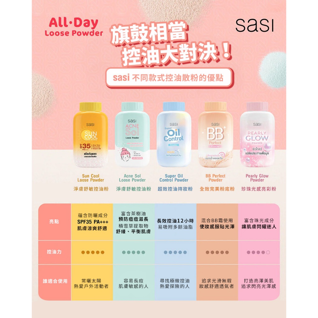 Sasi 定妝粉 全天持妝透亮粉|珍珠光感亮彩粉|超效控油持妝粉|BB全效完美粉底粉|涼感防曬控油粉|淨膚舒敏控油粉Sasi全天持妝透亮粉|Sasi珍珠光感亮彩粉|Sasi超效控油持妝粉|Sasi BB全效完美粉底粉|Sasi涼感防曬控油粉|Sasi淨膚舒敏控油粉FaceBeauty box 美麗百寶箱